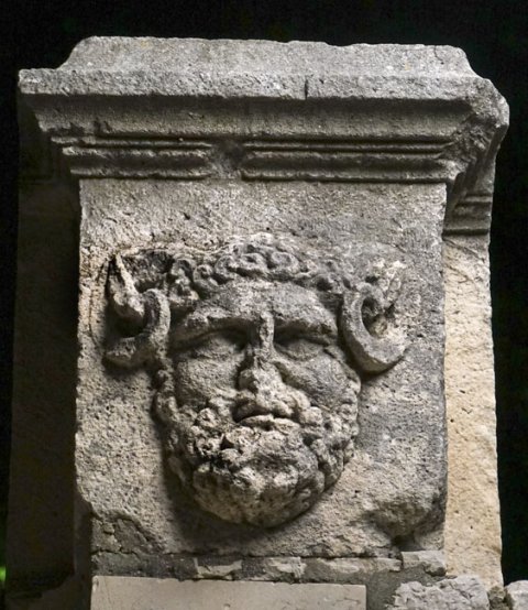 - Mythische Figur: Kopf des Jupiter Ammon mit Widderhörnern. Zwischenpfeiler eines Girlandenfrieses.