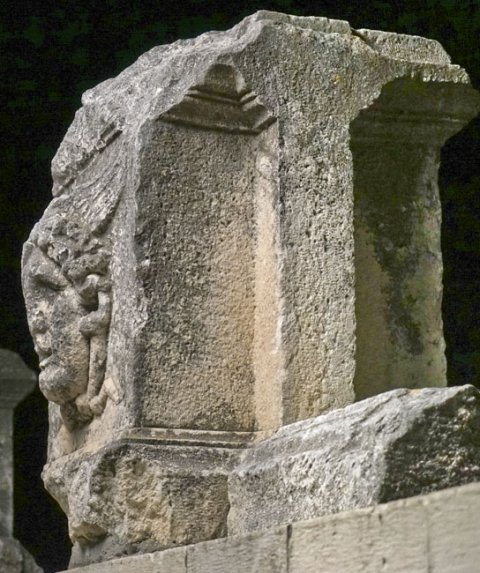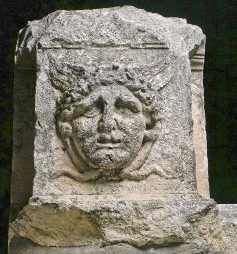- Mythische Figur: geflügeltes Gorgoneion. Zwischenpfeiler eines Girlandenfrieses.