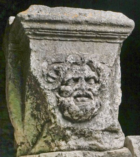 - Mythische Figur: bärtiger Jupiter Ammon- Kopf mit Widderhörnern. Zwischenpfeiler eines Girlandenfrieses.