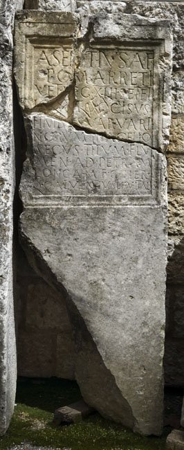 - A(ulus) Sentius A(uli) f(ilius) / Pom(ptina) Arreti(o) / vet(eranus) leg(ionis) XI h(ic) s(itus) e(st) t(estamento) f(ieri) i(ussit) / hic est occisus / finibus Varvari/norum in agello / secus Titum flu/men ad Petram / Longam f(aciendum) c(uravit) her(es) / Q(uintus) Calventius L(uci) f(ilius) Vitalis