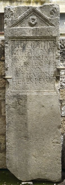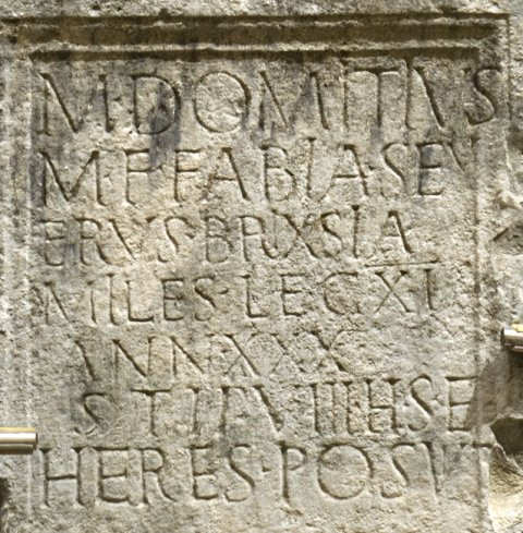 - M(arcus) Domitius / M(arci) f(ilius) Fabia Sev/erus Brixsia(!) / miles leg(ionis) XI / ann(orum) XXX / stip(endiorum) VIII h(ic) s(itus) e(st) / heres posuit
