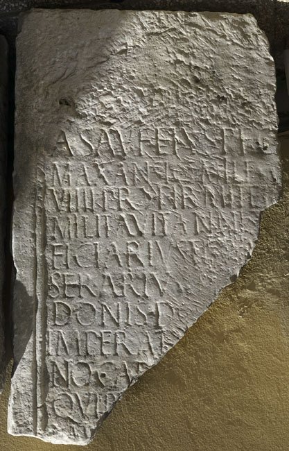 - A(ulus) Saufeius P(ubli) f(ilius) Ca[m(ilia)] / Max(imus?) Ansio miles c[oh(ortis)] / VIIII pr(aetoriae) |(centuria) Firmi Ter[tulli] / militavit annis [--- bene]/ficiarius t[rib(uni) tes]/serarius co[rnicular(ius)] / donis do[natus ab] / Imperat[ore ---]/no Cae[sare Aug(usto) tor]/quib[us ---] / [---