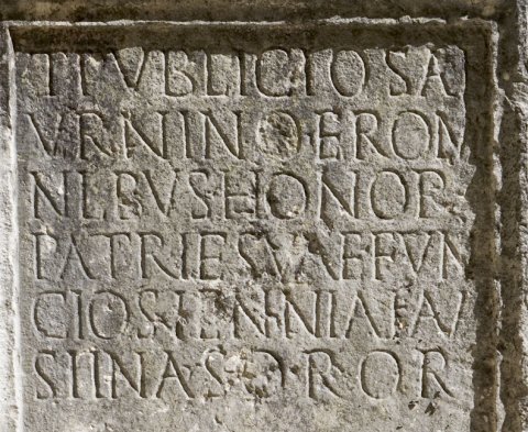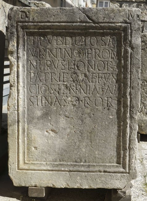 - D(is) M(anibus) // T(ito) Publicio Sai(!)/urnino er(atri)! om/nibus honor(ibus) / patri(a)e suae fun/cio! Siennia! Fau/siina! soror