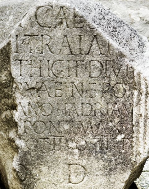 - [Im]p(eratori) Caes[ari] / [div]i Traian[i] / [Pa]rthici f(ilio) divi / [Ne]rvae nepoti / [Trai]ano Hadriano / [Aug(usto)] pont(ifici) max(imo) / [trib(unicia)] pot(estate) II co(n)s(uli) II p(atri) p(atriae) / d(ecreto) d(ecurionum)