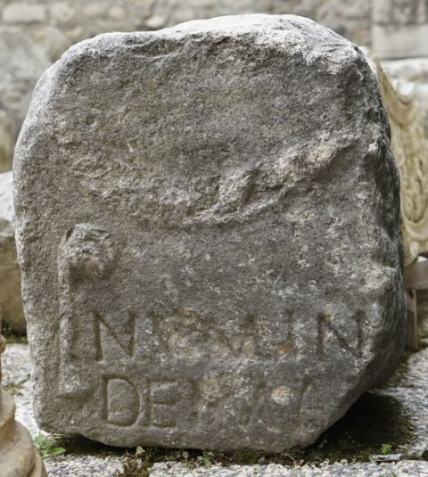 - Über der Inschrift Girlande, links der 1. Zeile Augurenstab (lituus).