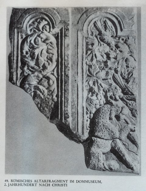 Eckblock: auf der Vorderseite Tiere links Rahmenfeld mit Rundbogen, darin Akanthusranke. Anschließend breites Feld mit Giebel zwischen zwei Bögen. Hockender Panther mit Füllhorn vor Weinranken mit Vögeln (nach rechts hin vermutlich Krater und zweiter Panther).