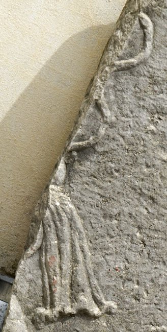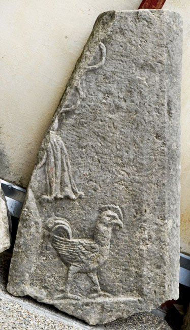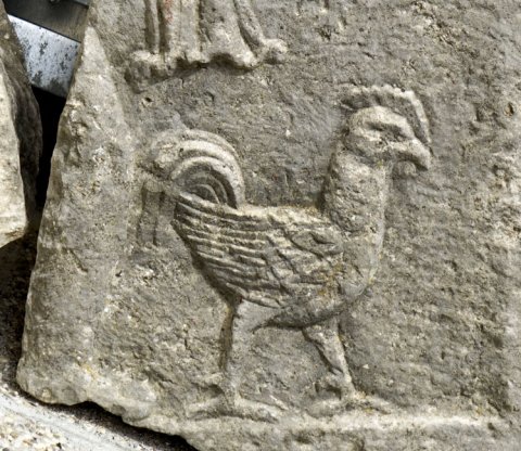 - Mythische Figur: Mercur (nur linkes Bein, Rest des linken Armes mit Mantel und Caduceus erhalten), neben dem linken Fuß Hahn.