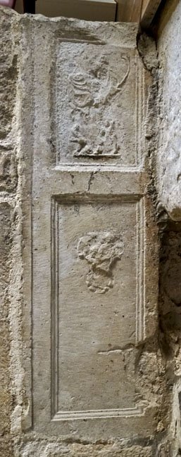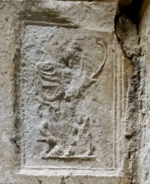 - Türflügel mit zwei Feldern, im oberen Feld Relieffigur eines Satyrs mit Pedum und sitzendem Panther, im unteren Löwenkopf-Türklopfer.