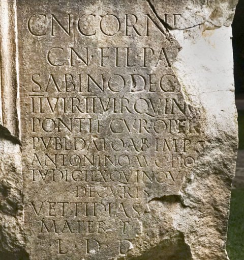 - Cn(aeo) Corne[lio] / Cn(aei) l(io) Pap(iria) / Sabino dec(urioni) a[ed(ili)] / IIviro IIviro quinq[uen(nali)] / pontif(ici) cur(atori) oper[um] / publ(icorum) dato ab Imp(eratore) [Caes(are)] / Antonino Aug(usto) Pio s[el(ecto)] / iudici ex qu- inque / decuri(i)s / Vettidia Sa[bina] / mater t(estamento) [p(oni) i(ussit)] / l(oco) d(ato) d(ecreto) [d(ecurionum)].