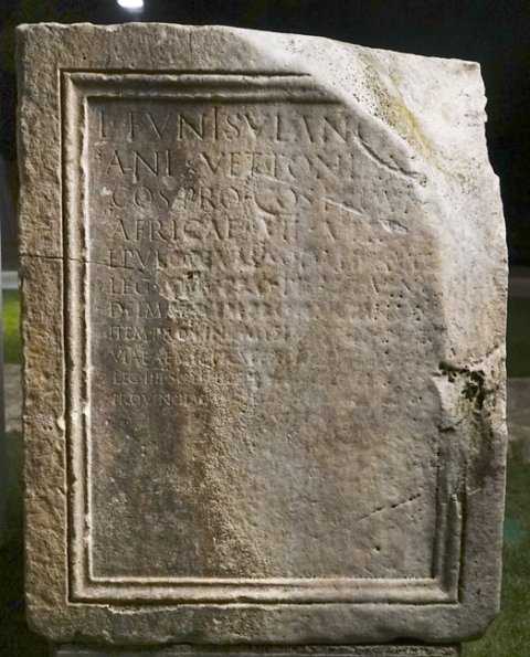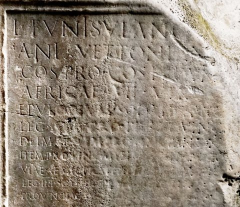- L(ucio) Funisulano [L(uci) f(ilio)] / Ani(ensi) Vettonian[o] / co(n)s(uli) proco(n)s(uli) provin[c(iae)] / Africae VIIvir(o) / epul- onum [sodali] Aug(ustali) / leg(ato) [A]ug(usti) [pro] pr(aetore) [pro]vinc(iae) / Delmat(iae) item [provinc(iae)] Pannon(iae) / item provin[c(iae) Moes(iae) sup(erioris) curato]r[i] / viae Aemili(ae) pra[e]f(ecto) a[er(ari) Saturni leg(ato)] / leg(ionis) IIII Scythic(ae) p[raet(ori) trib(uno) pleb(is) quaest(ori)] / provinciae [Siciliae trib(uno) militum leg(ionis)] / VI [Victr(icis) IIIvir(o) ---]
