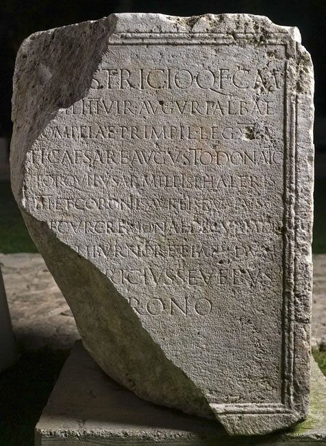 - [Q(uinto?) Ca]stricio Q(uinti) f(ilio) Cam(ilia) / [aed]ili IIvir(o) auguri Albae / [P]ompeiae prim(o) pil(o) leg(ionis) XI a / Ti(berio) Caesare Augusto donato / torquibus armilis phaleris / III et coronis aureis duabus / [d]ecur(ioni) Cremonae decur(ioni) Iad(e)r / [praef(ecto)] Liburnor(um) et Iapudum / [Q(uintus?) Cast]ricius Severus / [pat]rono