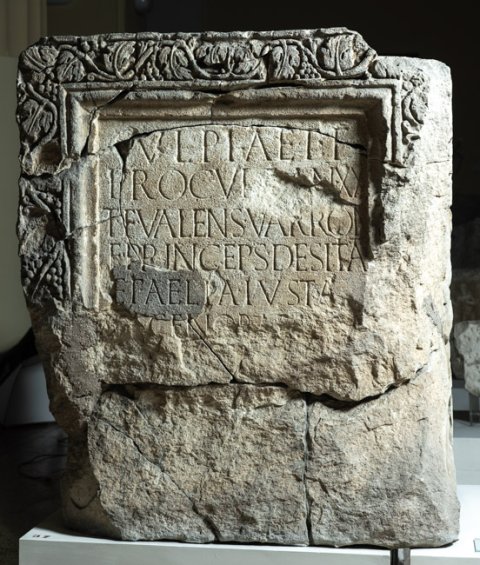- Ulpiae T(iti) f(iliae) / Proculae an(norum) XX / T(itus) F(lavius) Valens Varron(is) / f(ilius) princeps Desitiati(um) / et Aelia Iusta / Scenobar[bi f(ilia)] / [---