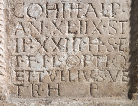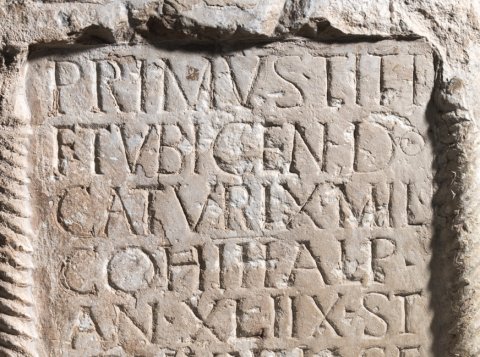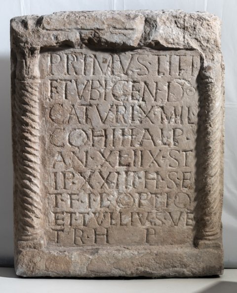 - Primus Tit{t}i / f(ilius) tubicen do(mo) / Caturix mil(es) / coh(ortis) III Alp(inorum) / an(norum) XLIIX st/ip(endiorum) XXIII h(ic) s(itus) e(st) / t(estamento) f(ieri) i(ussit) L(ucius) optio / et Tullius ve/ter(anus) h(eredes) p(osuerunt)