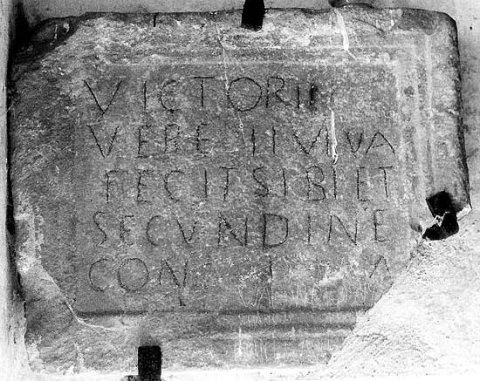 - Victorinus / Vebeni (filius) vi(v)us / fecit sibi et / Secundin(a)e / coniugi kar(issimae)