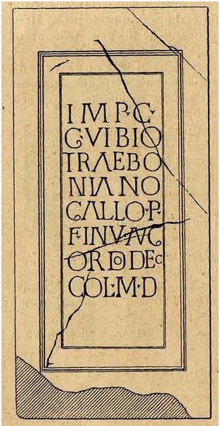 - Imp(eratori) C(aesari) / G(aio) Vibio / Traebo/niano(!) / Gallo P(io) / F(elici) Inv(icto) Aug(usto) / ordo dec(urionum) / col(oniae) m(etallae) D(omavianae)