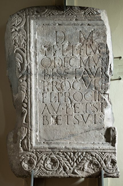 - D(is) M(anibus) / T(ito) Fl(avio) T(iti) f(ilio) Luci/o dec(urioni) mun(icipii) / Bis(tuae) et Aur(eliae) / Procul(a)e Fl(avia) Procill/a v(iva) f(ecit) et si/bi et suis