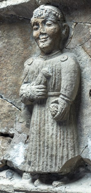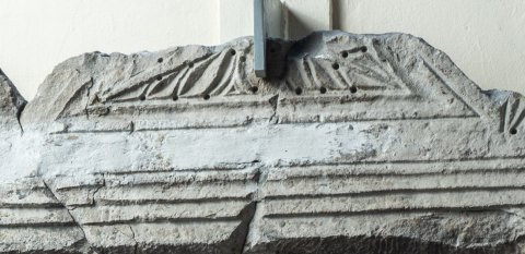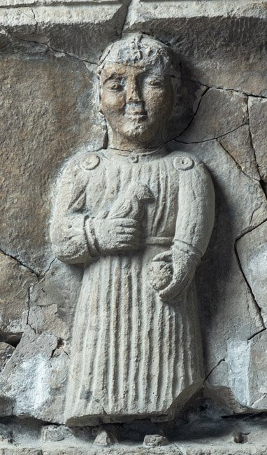 - Giebel mit vegetabilem Dekor und Seitenakroteren. Im von Pilastern flankierten Bildfeld stehende Ganzfigur eines einheimischen Mädchens im Ärmelkleid mit Gürtel, Scheitelschmuck, Halsband und Scheibenfibeln, Vogel in der rechten und Ball in der linken Hand. Auf der Rahmenleiste des Schriftfeldes Efeuranke.