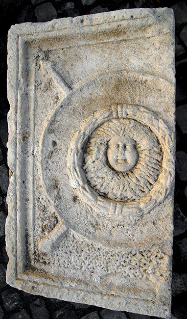 - Profiliert gerahmte quadratische Platte mit Rundschild und dahinter gekreuzten Lanzen. Im Schild Kranz, darin Maske (Gorgoneion ?).
