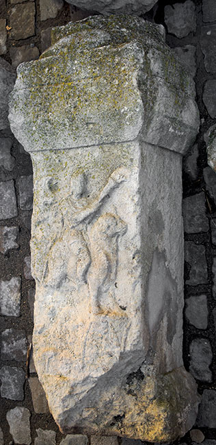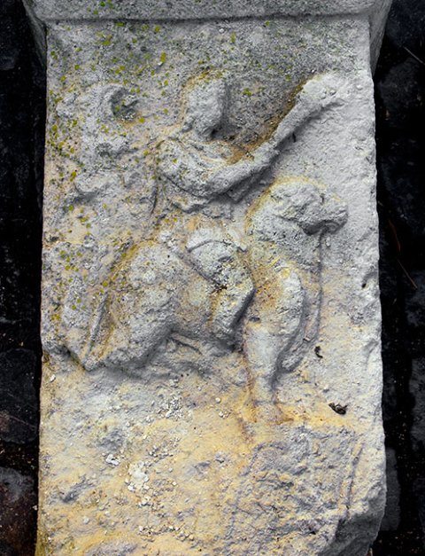 - Sockel verbr., Relief tlw. abgeschlagen, stark verwittert