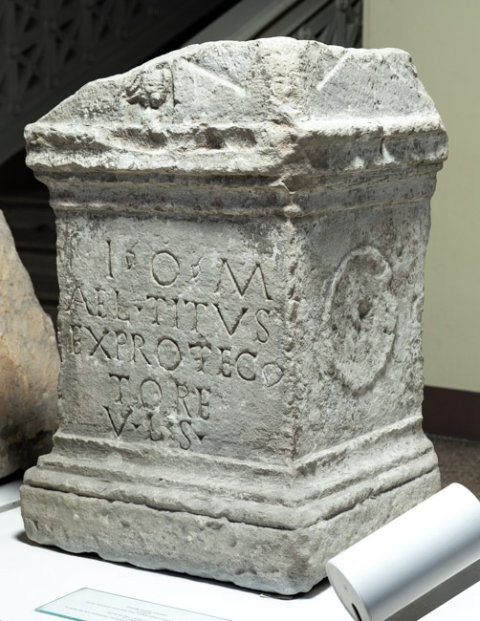 - I(ovi) O(ptimo) M(aximo) / Ael(ius) Titus / ex protec/tore / v(otum) l(ibens) s(olvit)