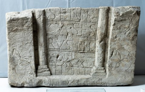 - "Japodische Urne": Schriftfeld zwischen Säulen. Seitlich breite Rahmenleisten, darauf eingeritzter Dekor (unten je eine Kreisrosette, rechts oben Mondsichel).