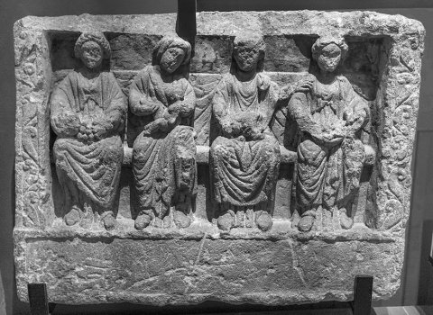 - Mythische Figuren: Muttergottheiten (matres, matronae) als sitzende Ganzfiguren auf einer Bank, bekleidet mit Tunica und Mantel. Ganz links mit Weintrauben, dann Nutrix mit Säugling, die dritte mit Hund auf dem Schoß, die vierte mit Fruchtkorb. Seitlich Pilaster mit vegetabilem Dekor, unten gerahmtes leeres Feld.