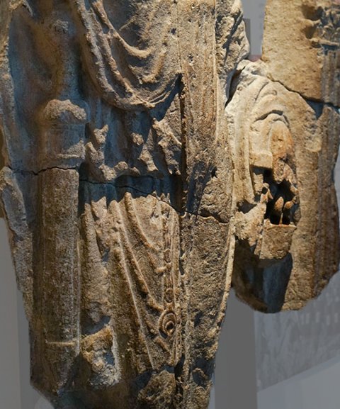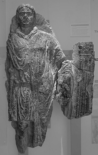 - Stehende Ganzfigur eines Soldaten (Offizier) in kurzer Tunica, Paenula und Halstuch. Gürtel mit Lunula-Anhänger, an der rechten Seite Schwert, in der linken Hand geschlossenes Polyptychon (?). Rechts Rest eines kannelierten Pilasters mit Blattkapitell. Teil einer Grabaedicula oder einer großen Stele ?
