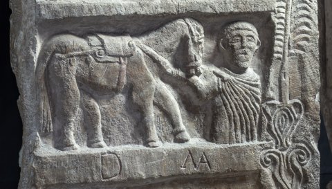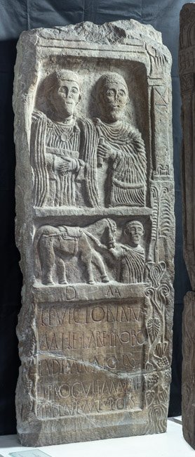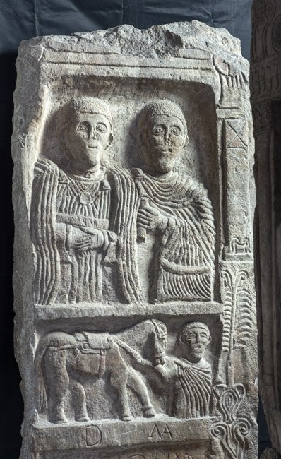 - Im Hauptbildfeld zwischen Pilastern zwei Dreiviertelfiguren (Ehepaar): links einheimische Frau mit Umhang, Gürtel, Hals- und Brustschmuck. Rechts bärtiger Mann im Sagum, in der Linken Rolle (volumen). Im Zwischenbild darunter Calo mit gesatteltem Pferd. Auf den seitlichen Rahmenleisten unten Ranken, dsrüber Gefäß mit Palmzweig.