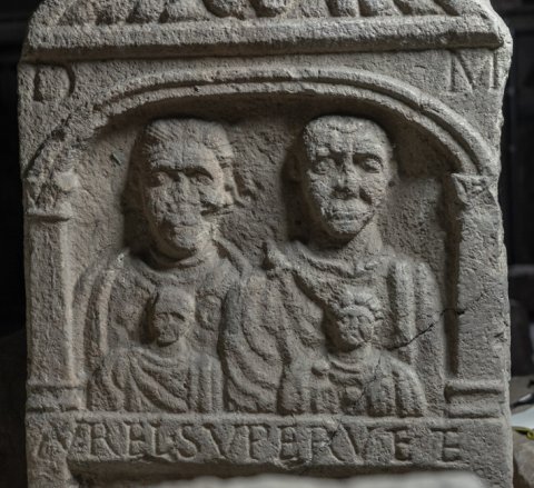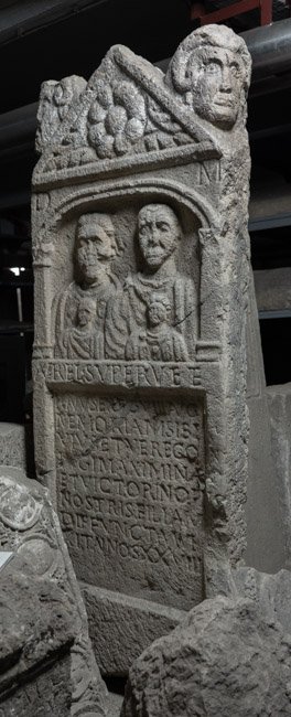 - Giebel mit Rosette und Blättern, Ammonsmasken als Akrotere. Im Bildfeld unter flachem Bogen auf Pilastern Halbfiguren einer Familie: links Frau mit Umhang und Halsband, vor ihr Kind (Knabe) mit Sagum. Rechts bärtiger Mann im Sagum mit Bügelfibel, vor ihm Kind (Mädchen).