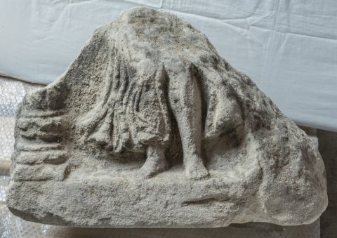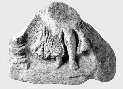 - Mythische Figur: Beine einer bewegten weiblichen Figur mit entblößtem linken Unterschenkel (Victoria ? Venus ? Nymphe ?). Links Rest einer kannelierten Säule mit attischer Basis.