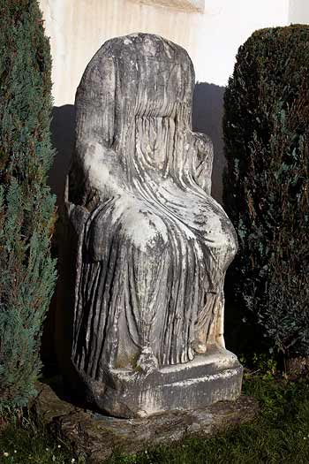 - Sitzstatue einer einheimischen Frau: Lehnsessel, Tunica mit Gürtel, Umhang, Brustschmuck, Halsband mit Lunula.
