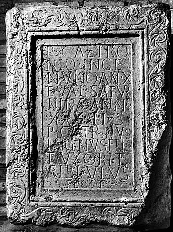 - P(ublio) Caetro/nio Inge/nuino an(norum) X / et Val(eriae) Satur/ninae anno(rum) / XXX h(ic) s(iti sunt) / P(ublius) Caetronius / Ingenu(u)s filio / et uxori et / sibi vi(v)us / fecit