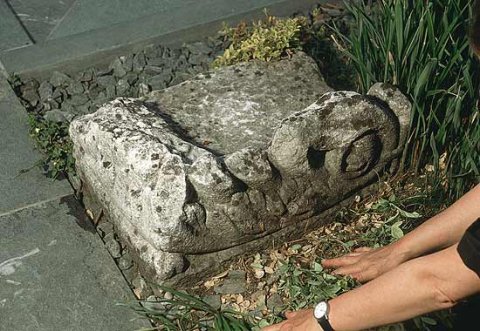 - Teil eines Grabaltars. Auf der Vorderseite Akanthusranke, außen zu Volute (pulvinus) eingerollt
