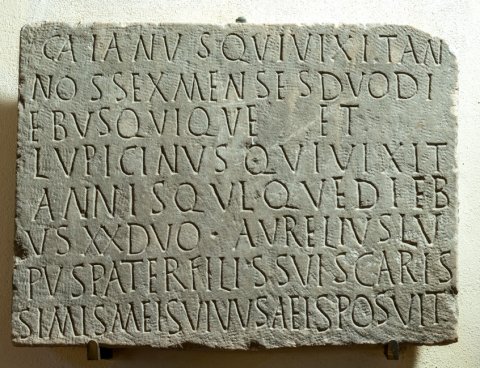 - Gaianus qui vixit an/nos sex menses duo(s) di/ebus(!) qui(n)que et / Lupicinus qui vixit / annis qui(n)que di/ebus XX duo Aurelius Lu/pus pater fili(i)s suis caris/simis meis vivus aeis(!) posuit