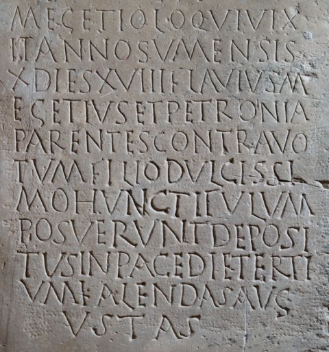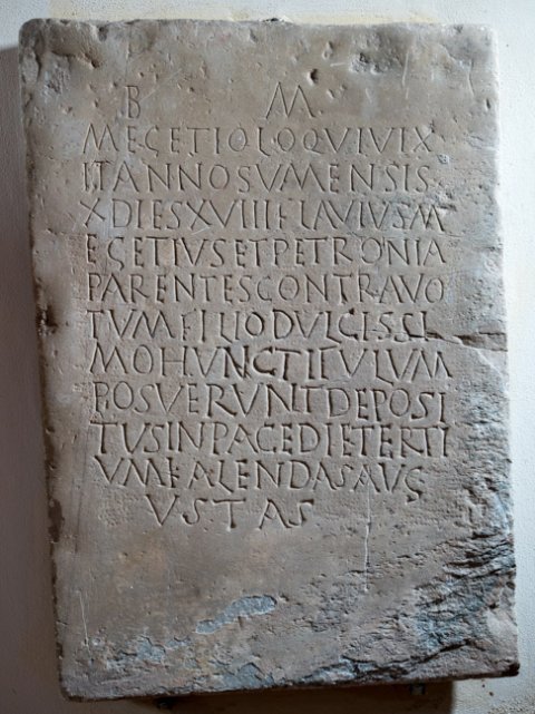 - B(onae) m(emoriae) / Megetiolo qui vix/it annos V mensis(!) / X dies XVIII Flavius M/egetius et Petronia / parentes contra vo/tum filio dulcissi/mo hunc titulum / posuerunt deposi/tus in pace die terti/um Kalendas Aug/ustas