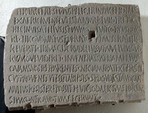 - Hic iacet Restutus peleger in pace fidelis / ex Africa venit ut istam urbe(m) videret / h(a)ec invisa tellus istum voluit corpus habe/re hic quo natus fuerat optans erat illo / reverti id magis crudelius ut nullum suo/rumque videret invenerat satis amplius / quam suos ipse parentes nec iam erat exter si/cut provenit ut esset ab ipsis sed quo fata vocant / nullus resistere possit huic sodalicium Floren/sium contra votum fecerunt