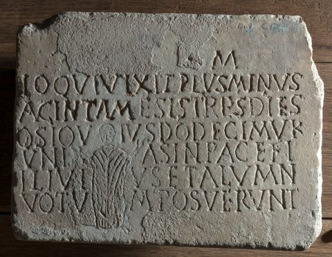 - [B(onae)] m(emoriae) / [---]io qui vixit plus minus / [annos ---]aginta me(n)sis (!) tres dies / [---] depos(s)io viv(u)s dodecimu(m) K/[alendas I]unias in pace fi/[delis f]ili(i) viv(u)s et alumn(i) / [contra] votum posuerunt