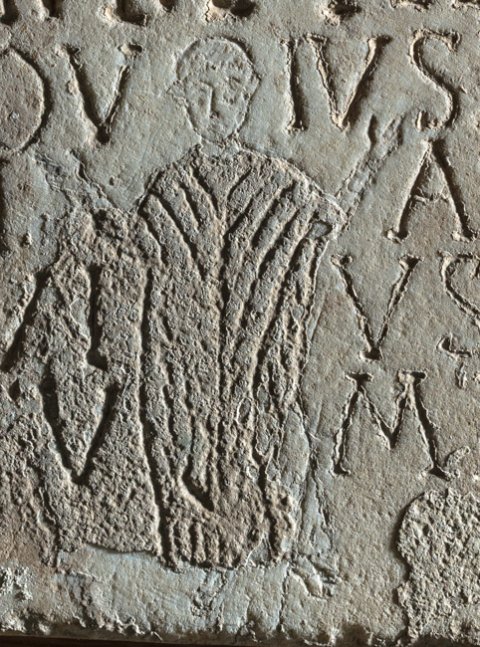 - Innerhalb der drei letzten Zeile Ritzzeichnung: stehender Orant.