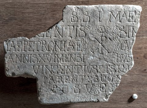 - [dulci]ssimae(?) [et in]/[no]centissim[ae fil]iae Petroniae qu[ae vixit] / annis XVI mensibus [---] / Vincentius et Sim[plicia] / parentes con[tra votum] / posuer[unt]