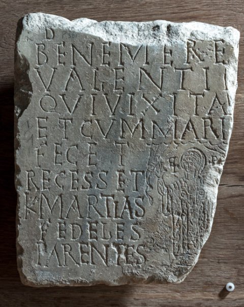 - B(onae) m(emoriae) / bene mere[nti ---] / Valentin[ianae] / qui vixit an[nos ---] / et cum mari[to ---] / fecet(!) [annos ---] / recesset(!) [in pace] / K(alendas) Martias [---] / fedeles(!) [---] / parentes [---]