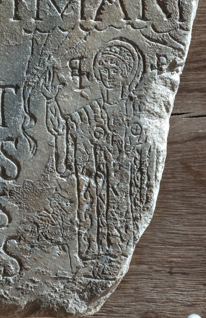 - Innerhalb der Inschrift Ritzzeichnung: Orantin zwischen Vorhängen, neben dem Kopf je ein Christogramm, neben dem rechten Bein Lamm (?).