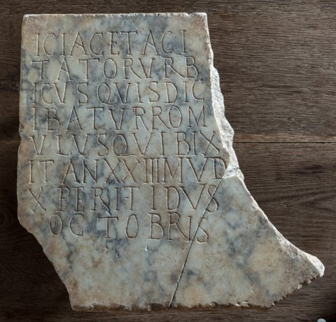 - (H)ic iacet agi/tator Urb/icus quis(!) dic/ibatur(!) Rom/ulus qui bix/it(!) an(nos) XXIII m(enses) V d(ies) / X peri(i)t Idus / Octobris(!)