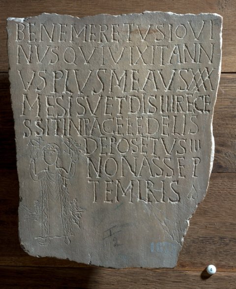 - Bene meretus(!) Iovi/nus qui vixit ann/us(!) plus meaus(!) XXX / me(n)sis V et dies III rece/ssit in pace fedelis(!) / deposetus(!) III / Nonas Sep/temiris(!)