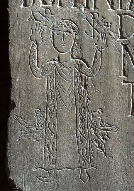 - links unten neben der Inschrift Ritzzeichnung: Orant, über den Händen je ein Christogramm mit Alpha bzw. Omega. Seitlich der Figur je ein Taube auf einem Zweig.