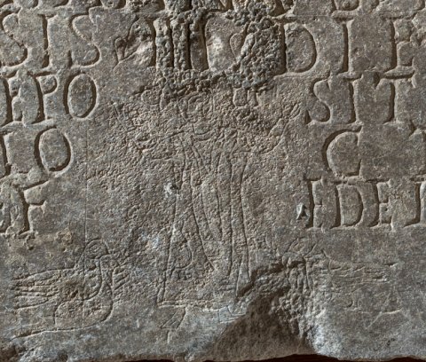 - Unten innerhalb der Inschrift Ritzzeichnung: Orant, neben dem Kopf Alpha und Omega, zu seinen Füßen Tauben.