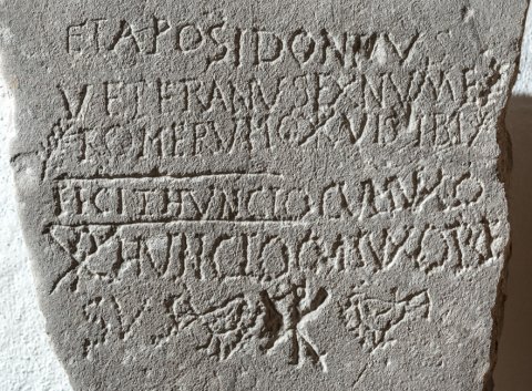 - Fla(vius) Posidonius / veteranus ex nume/ro merum qui sibi / fecit hunc locum uxo(ri) / hunc locum oxorie(!) su(a)e