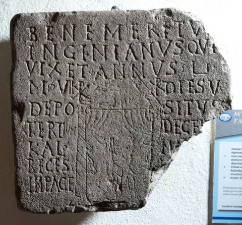 - Bene meritus / Inginianus qui / vixet(!) annus(!) LI / m(enses) VII dies V / depositus / tertium decem / Kal(endas) M[aias] / reces[sit] / in pace [---]
