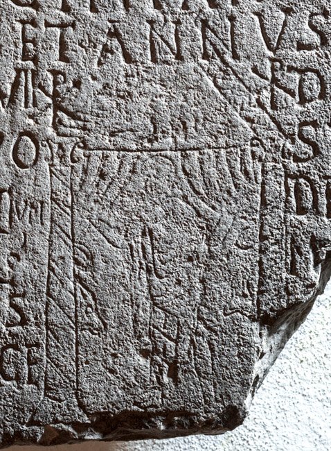 - innerhalb der Inschrift Ritzzeichnung: Aedicula mit Säulen mit Spiralkanneluren und Vorhang, dazwischen stehender Orant. Seitlich des Giebeldaches je ein Christogramm.