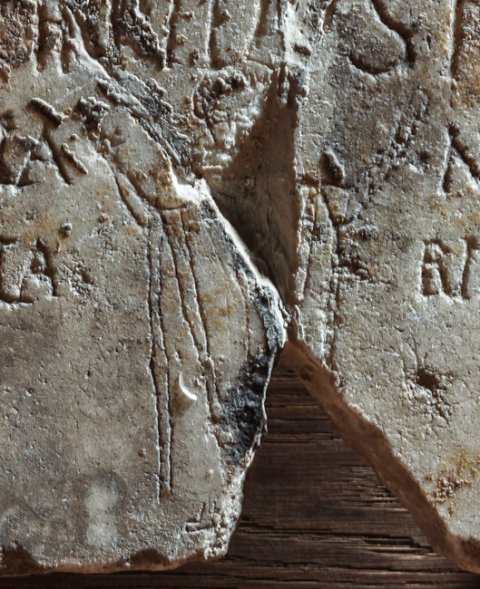 - oben links Christogramm mit Alpha und Omega, unten innerhalb der Inschrift Ritzzeichnung: Orant