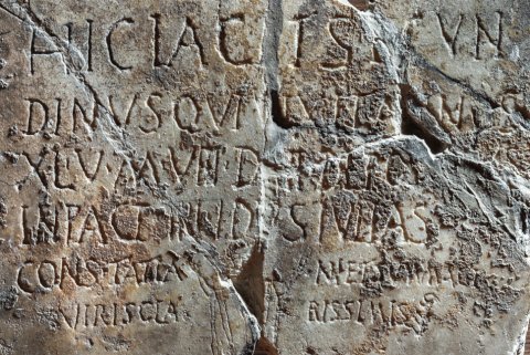 - Hic iacet Secun/dinus qui vixit an[n]os / XLV m(enses) VIII d(ies) III depos[itus] / in pace IIII Idus Iulias / cons(ulibus) Tatiani et Summac(h)i(!) / viris clarissimis